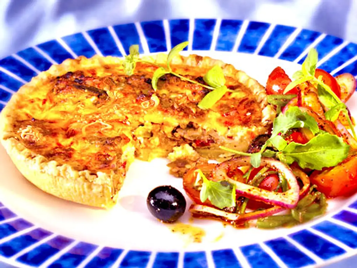 Tacopaj, en underbart god paj med tacokryddad köttfärs under ett täcke av tomat och crème fraiche!