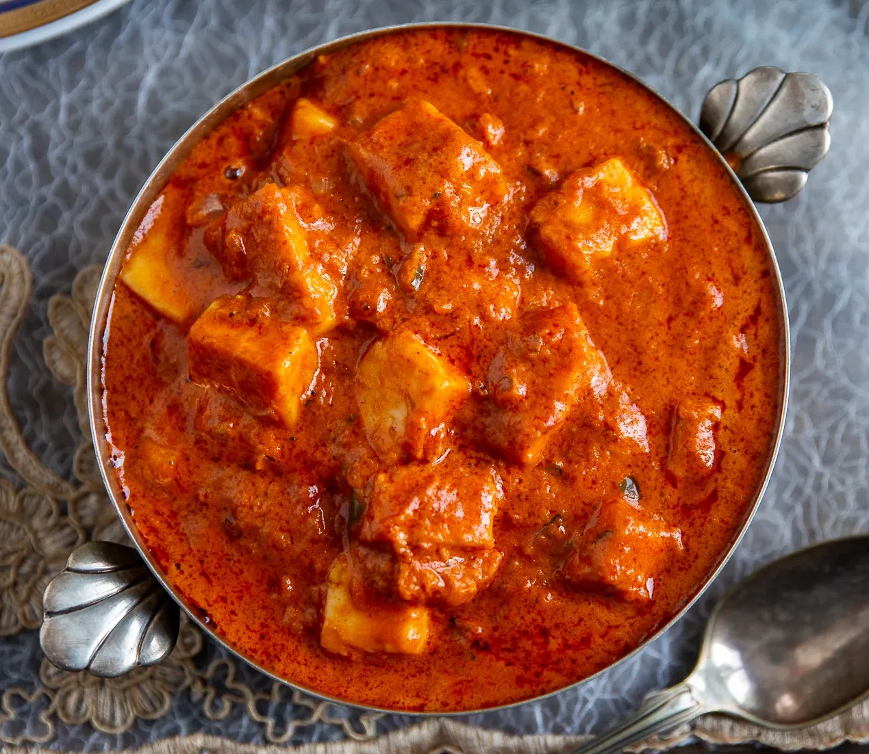 En förenklad variant på den kryddiga och krämiga indiska grytan butter chicken. Här byts kycklingen mot halloumi och blir då vego och betydligt mer snabblagad.