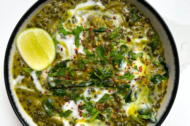 Den här krämiga lins grytan är en enkel gryta som kan lagas i en och samma kastrull. Den lämpar sig att göras i större portioner, full med proteiner, näringsämnen och smaker. Serveras med bread elle ris.